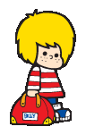 Billy is a human boy character from the Japanese company Sanrio. He is friends with Patty & Jimmy. Billy wears a red and white horizontal striped shirt, blue jeans, and blue sneakers. He carries a red satchel with his name on the side. His hair is yellow and shaggy, his eyes are solid black circles, and he has freckles on his cheeks.
