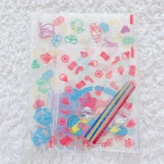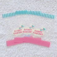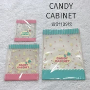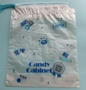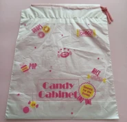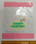 Candy Cabinet is a Sanrio design collection introduced in the late 1970s, possibly 1979 at the earliest. Plastic bags, dishes, tins, apparel and other goods were produced with colorful, bright, and pastel designs themed to sweets and candies.