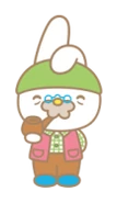 Grandpa is a white male rabbit character from the Japanese company Sanrio. He is My Melody's grandpa and Grandma's husband. Grandpa has white fur, a grey mustache, and a yellow oval nose. He wears a green and white plaid button down shirt, a red vest, brown pants, blue shoes, a green hat, and blue spectacles on the bridge of his nose. He smokes a brown pipe.