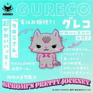 Gureco (グレコ) is a childhood friend of Kuromi from Mariland who appears in Kuromi’s Pretty Journey. She admires Kuromi So much , though to her she is like a little sister. She has the ability to use “fantasy magic” which brings her thoughts and fantasies into reality, though she hasn't learned to control it yet, making it come out at random times.