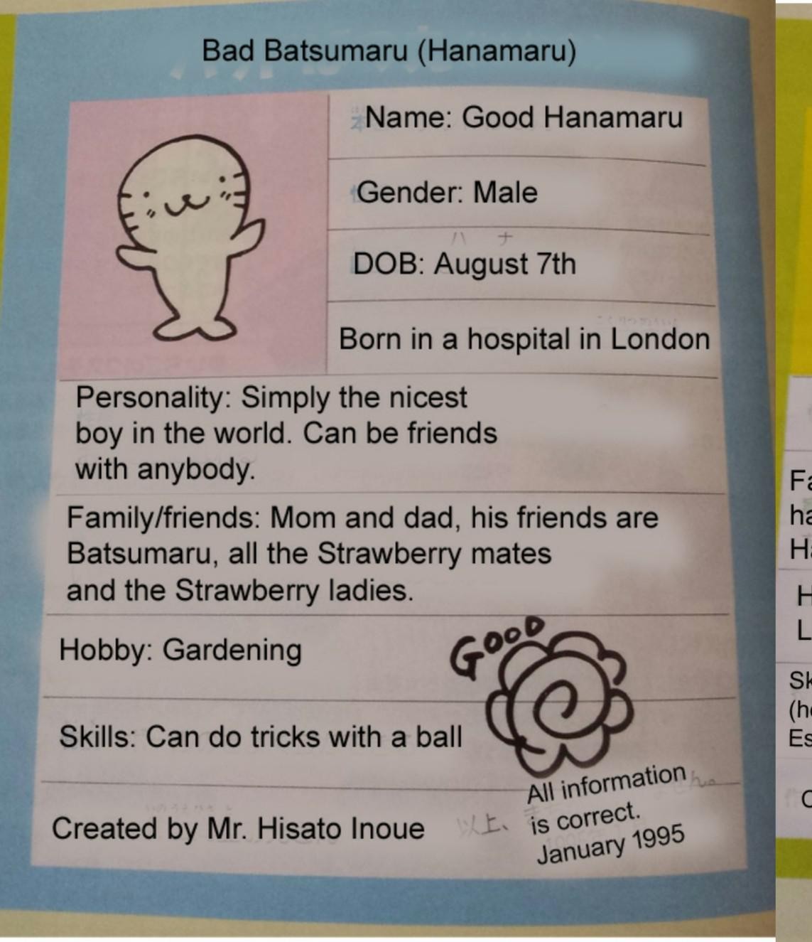 Hana-Maru was born one day before Pandaba on August 7. He is a white seal born at Kokuritsu Hospital, located in London. He can do ball acrobatics and likes gardening. In Japanese, he is called Good Hana-Maru, in contrast to Bad Badtz-Maru. A 'hanamaru' is a swirly and elaborate circle-mark, signifying not just a correct answer but a very good one. It is used as a star would be in Western culture.