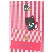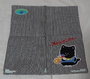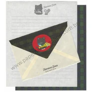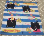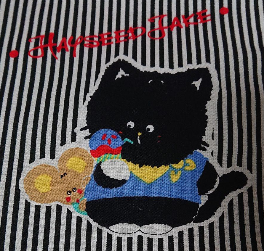 Hayseed Jake is a chubby anthropomorphic boy black cat with white paws, eyebrows, inner ears, and a yellow nose. He is usually illustrated wearing a colorful shirt and scarf. According to his merchandise, he wants to lose weight, but loves ice cream. A mouse character is sometimes seen with him, encouraging him to stop eating ice cream and other treats.