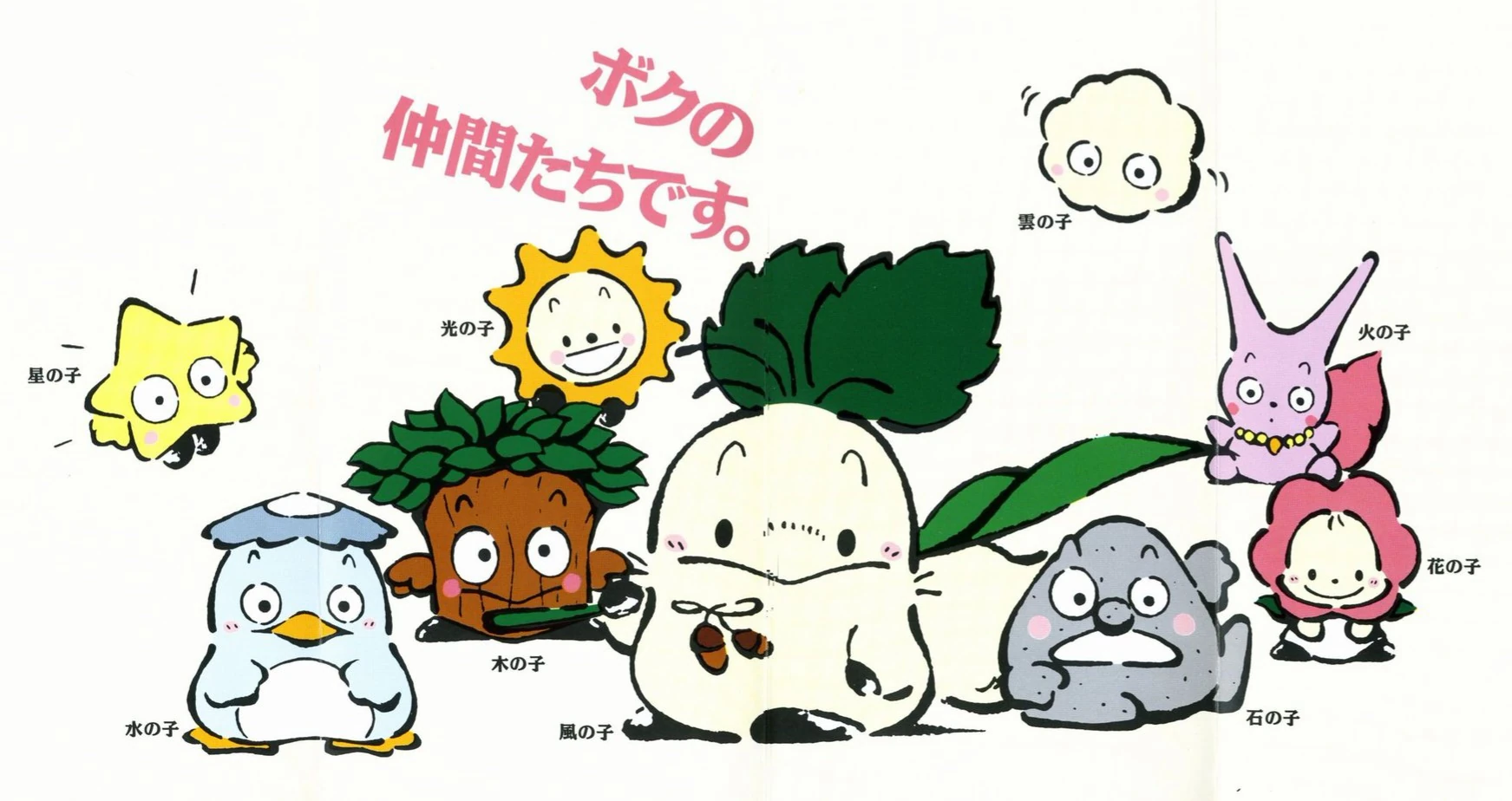 Cloud Child (雲の子): Always follows the Water Child and is impressed by everything they say. When angry, they can become a storm, but they are a carefree child who loves to float around lazily. They resemble a cloud.