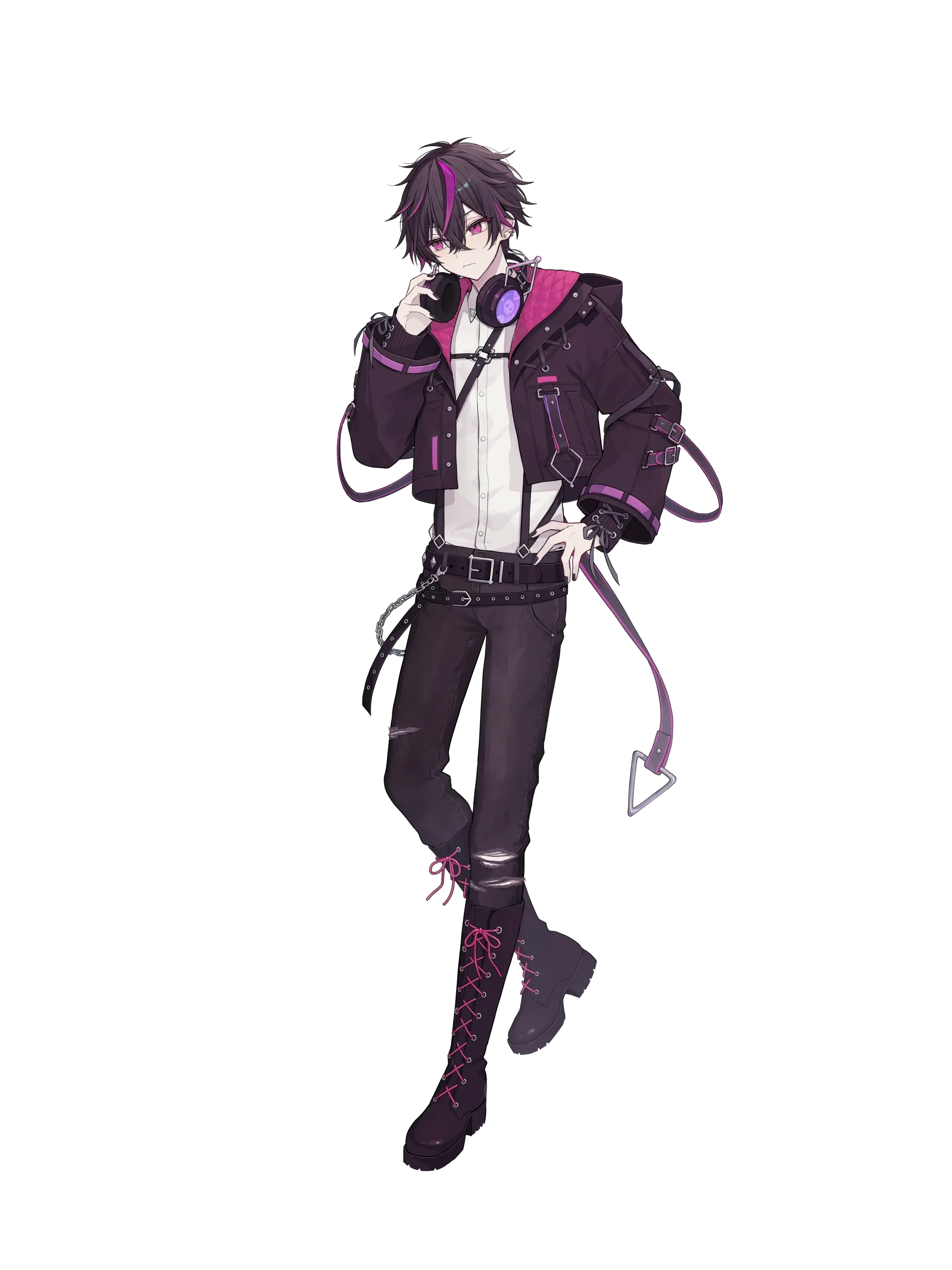 His outfit consists of a white dress shirt with a black harness worn under a dark purple cropped jacket. He wears a set of dark wool sleeves on both of his arms decorated with gray ribbons. He wears a pair of dark, ripped skinny jeans held up with several belts decorated with spikes and a chain. He also wears a pair of dark high-rise boots with pink laces.