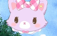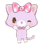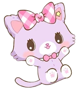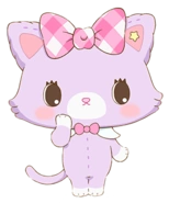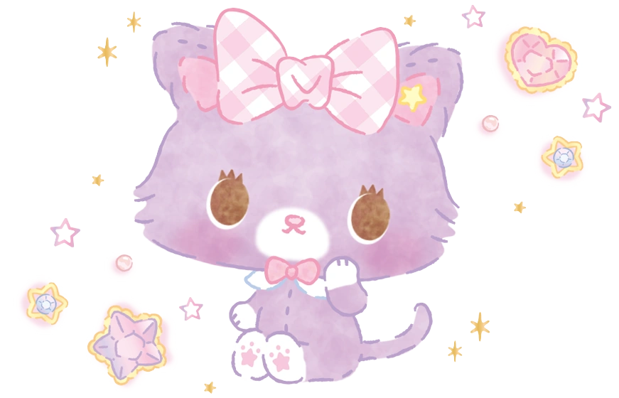 She wears a white collar with a pink bow, and a pink gingham bow on her head (lilac gingham in earlier designs). Mew is often seen with her favorite star-shaped polka-dotted pillow.