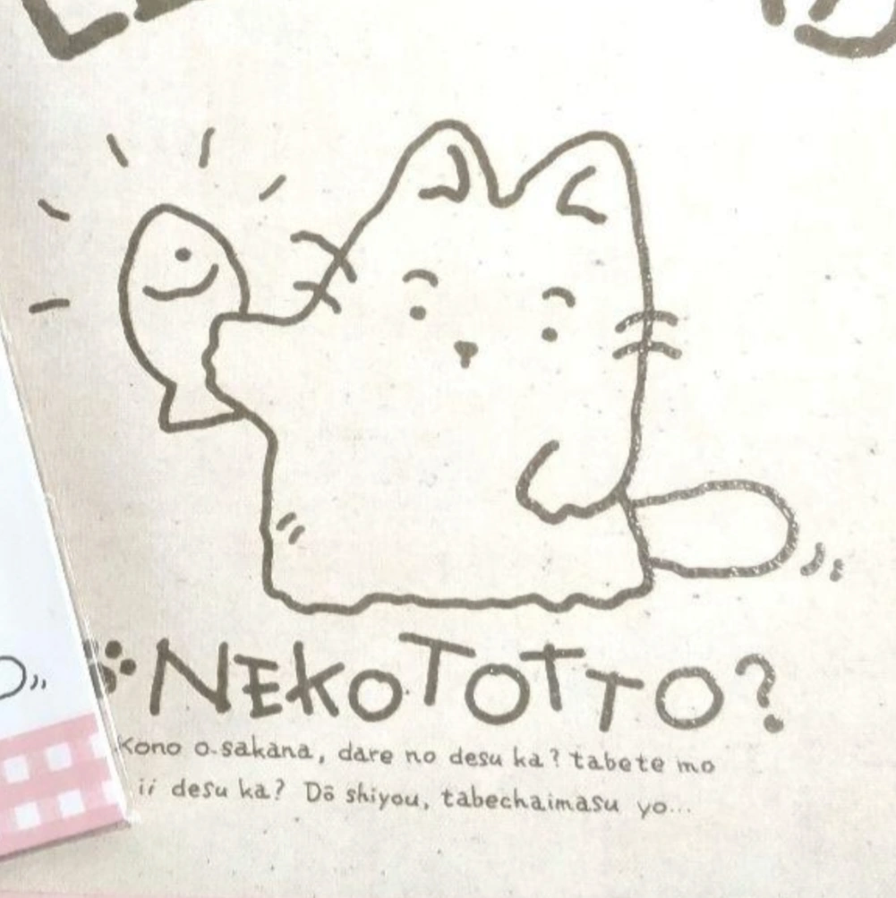 Nekototto (ネコトット), often stylized as "NEKOTOTTO?", is a Sanrio character who debuted in 1984. They're a white cat who likes eating fish. "Kono osakana, dare no desu ka? tabete mo ii desu ka? Dō shiyou, tabechaimasu yo...", often seen on their merchandise, roughly translates to "Whose fish is this? Can I eat it? What should I do, I'll eat it..."
