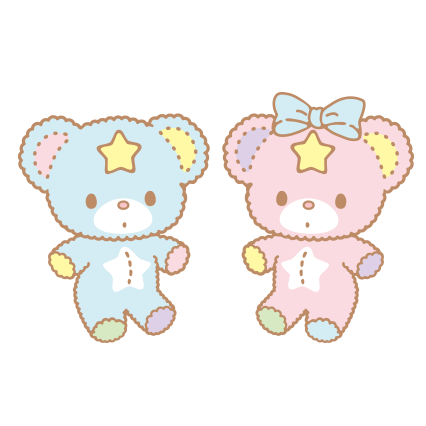 Puff & Poff (パフ&ポフ) are Sanrio characters from the Little Twin Stars Universe. They are two teddy bears made by fairies and specially designed for Kiki and Lala. The fairies made them out of the sky, stars, rainbows and clouds. They cut the cloth from the sky, the thread was spun from rainbows, and the buttons from stars. Puff is pastel blue, and Poff is pink and wears a blue bow on its head.