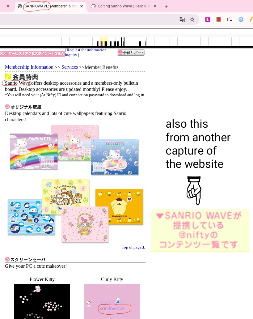 Along with all of the @Nifty benefits, Sanriowave offered exclusive services like a @kitty.sanrio.ne.jp Email, Sanrio character wallpapers in a wide variety of colors, as well as desktop items such as original browsers, fonts, screensavers, and more through Hello Kitty Club or a general website for those who had an account, they also made various websites and characters but most of them are lost to time, here is a list of their most popular and known projects.