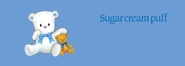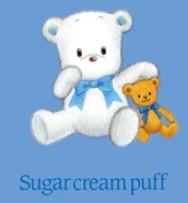 Sugar Cream Puff (シュガークリームパフ, Shugā kurīmu pafu) is a white teddy bear character from Sanrio. He is laid-back and stylish. He enjoys collecting ribbons, leisurely shopping, and reading picture books. He is very good at making milk tea and giving hugs.