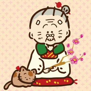 Umeya Zakkaten's cat. Brown spotted cat, red silk ribbon around neck.