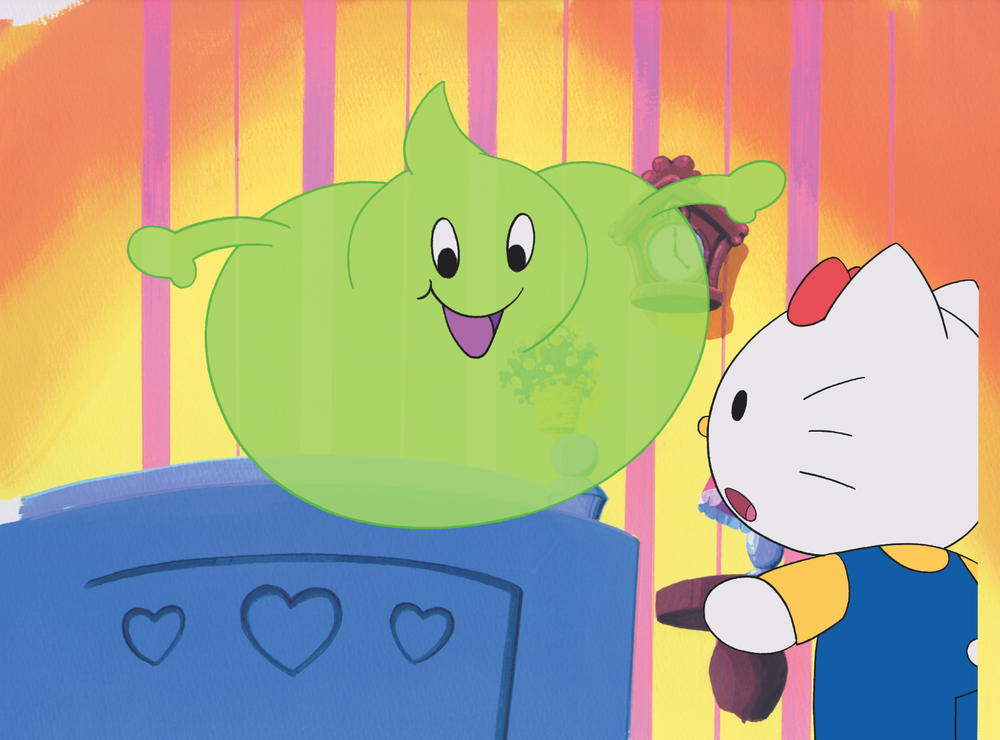 Yeah What is a lime green, translucent, floating monster that appeared in Replying Properly, an episode of Growing Up With Hello Kitty. His favorite kids always reply with "Yeah, what?", and whenever he hears someone say those words, he gets bigger. This scared Kitty until he shrank down to nothing. To make him shrink, say the word "Yes", which also scares him. It is unknown what he wants or if he is a real threat, but he is intimidating. He has a round green body with a tapering tail and no legs or feet, with thin arms up high, ending in hands, and a round head on top with a tapering point on the tip. He has large eyes, a large mouth, and a deep, slightly nasal, masculine voice.