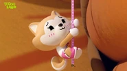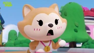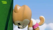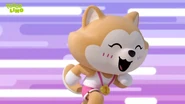 Zing is a tan Akita Inu dog who wears a white shirt, pink shorts, pink and white shoes and a number one medal with a pink ribbon around her neck. The number one in her medal stands for her status as the champion of Cherry Town.